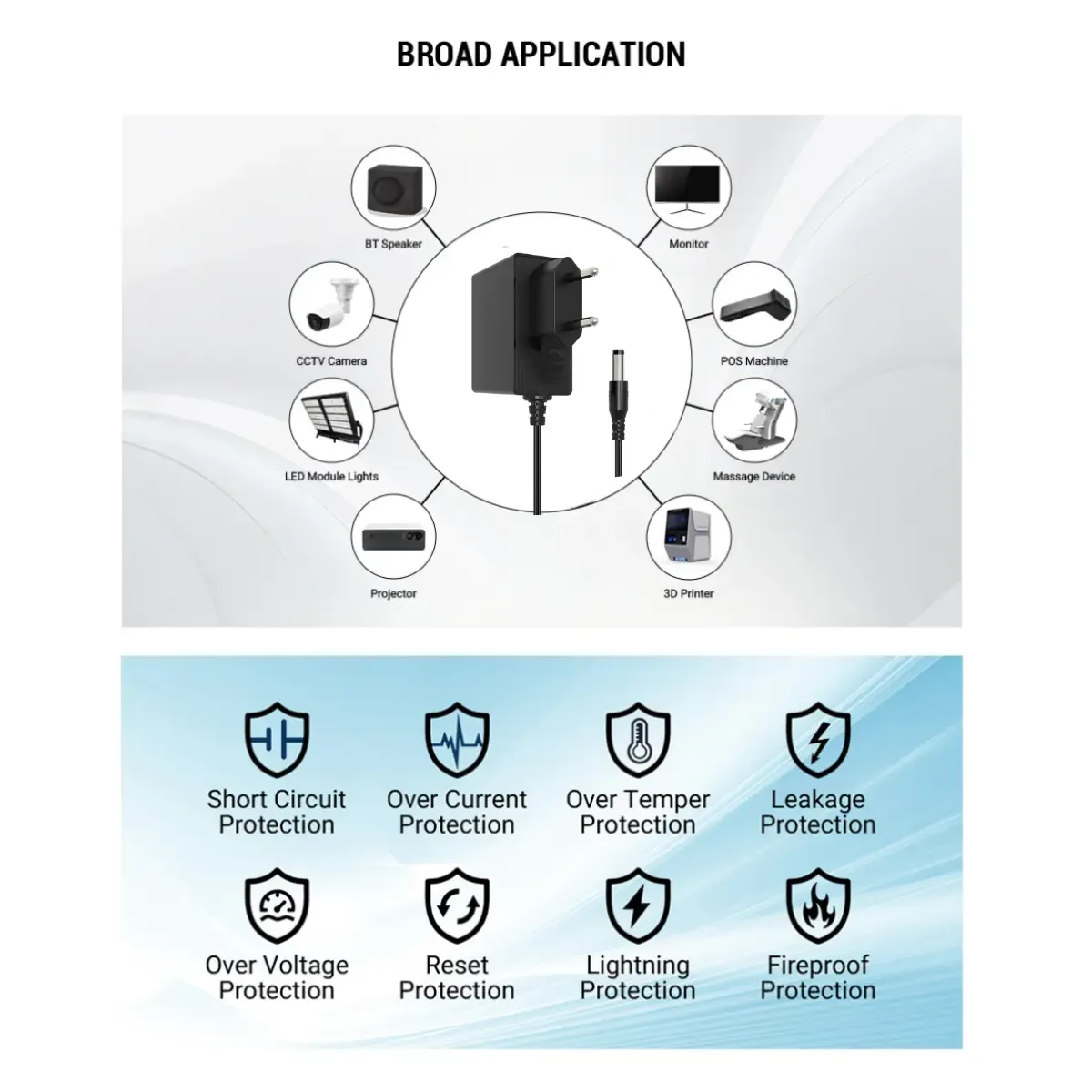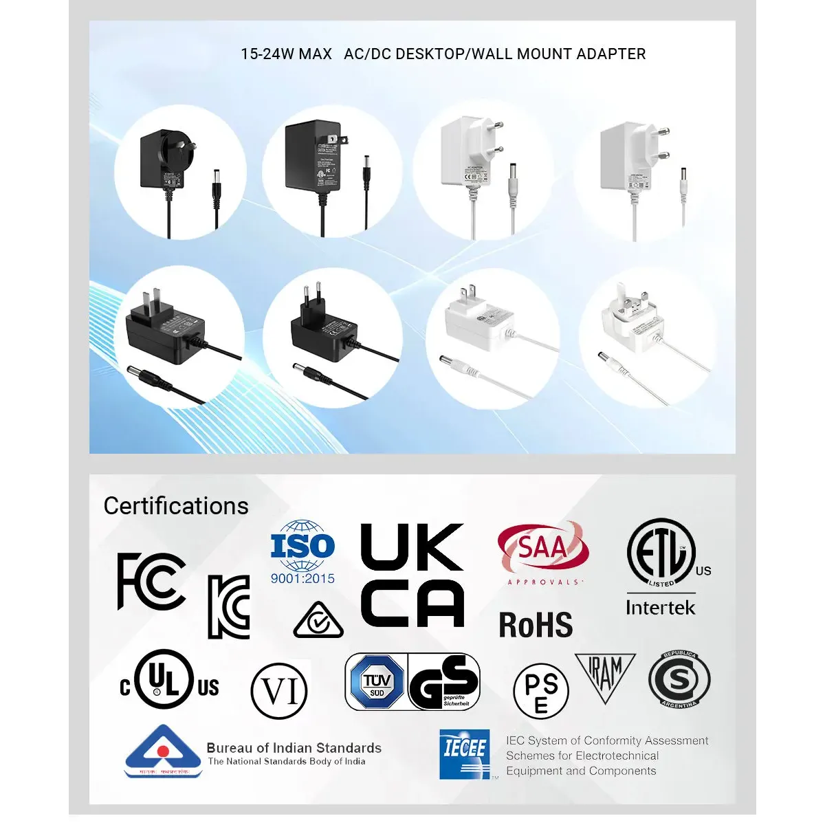 24 W maitinimo adapterių serija atitinka griežtus tarptautinius standartus ir turi pasaulinius sertifikatus, įskaitant CE/FCC/UL/RCM/SAA/UKCE/KC/BIS/PSE sertifikatą, užtikrinantį saugos ir aplinkosaugos reikalavimus. Jo europietiška kištuko konstrukcija leidžia saugiai prijungti, todėl jį lengva naudoti įvairiais parametrais.