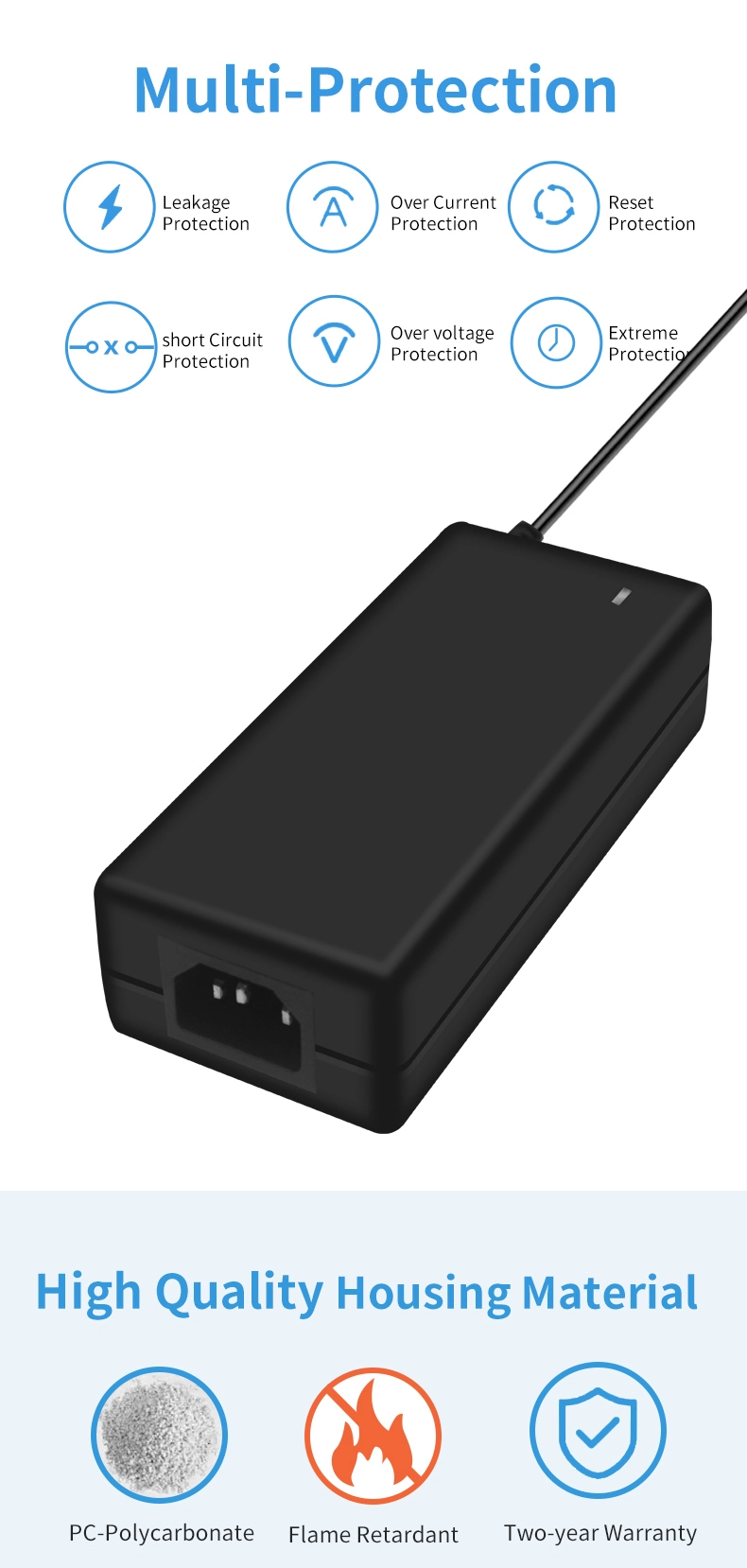 STARWELL maitinimo adapteris yra sertifikuotas pagal tarptautinius standartus, tokius kaip UL/CE/FCC/CCC, ir turi 6 sluoksnių apsaugą (OVP suveikia esant 15 V, OCP prie 8,5 A, OTP prie 85 ℃, trumpojo jungimo, viršįtampio ir ESD apsauga). PC+ABS antipireninis korpusas pasiekia V0 degumo laipsnį, atsparus degimui 30 sekundžių degant 750 ℃ temperatūroje, pašalinant galimus pavojus saugai.