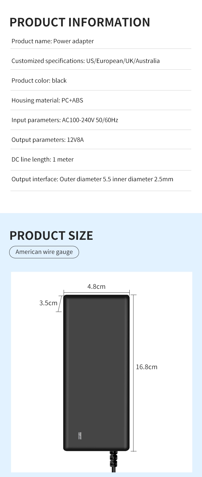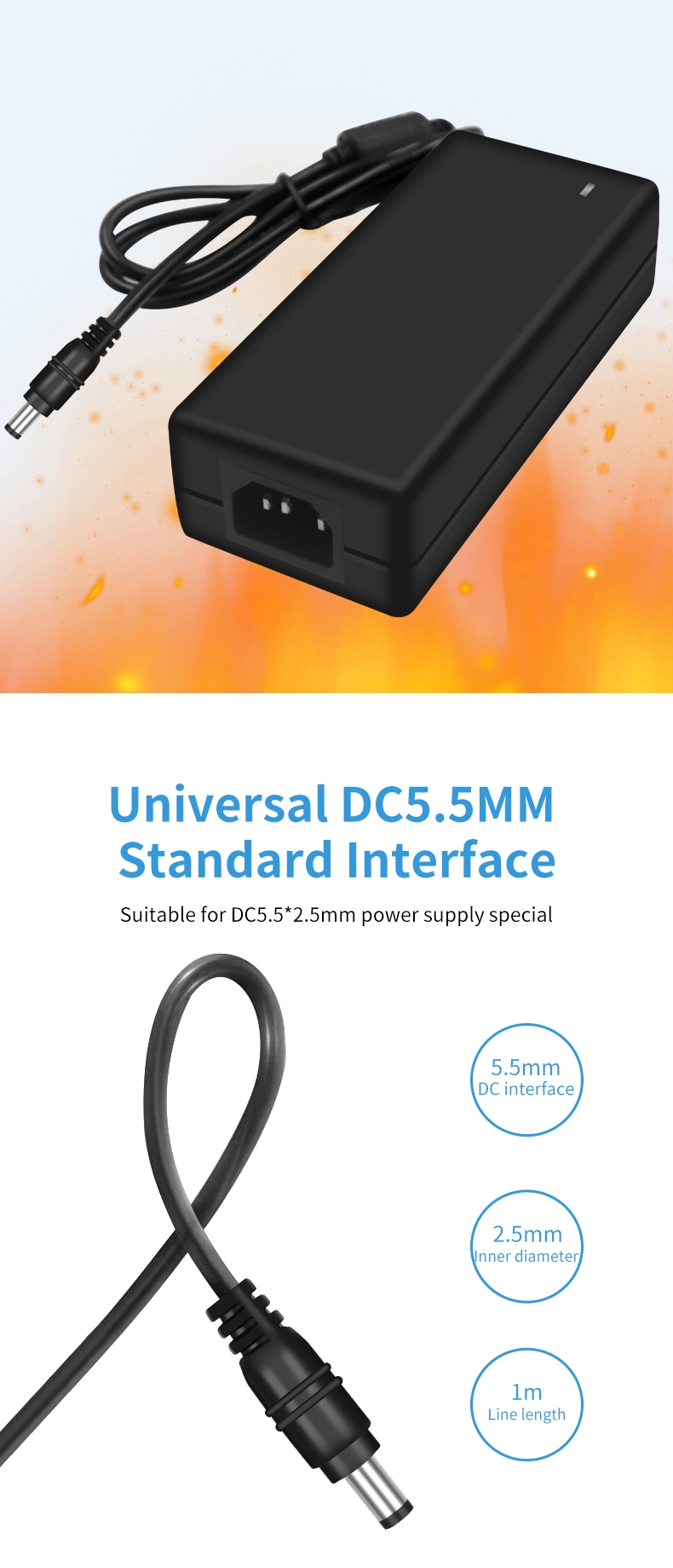 AC 100–240 V pločio įtampos įvestis yra suderinama su elektros tinklais daugiau nei 100 šalių visame pasaulyje. 1,5 m prailgintas išvesties kabelis (1,0 mm² skersmens), suporuotas su 180° pasukama nuolatinės srovės jungtimi, prisitaiko prie įvairių įrengimo scenarijų. Kompaktiško dydžio, tik 120 × 60 × 30 mm, jis yra 35 % mažesnis nei tradiciniai tos pačios galios adapteriai, sveria tik 280 g, todėl nešiojamumas pagerėja 50%.