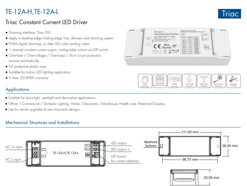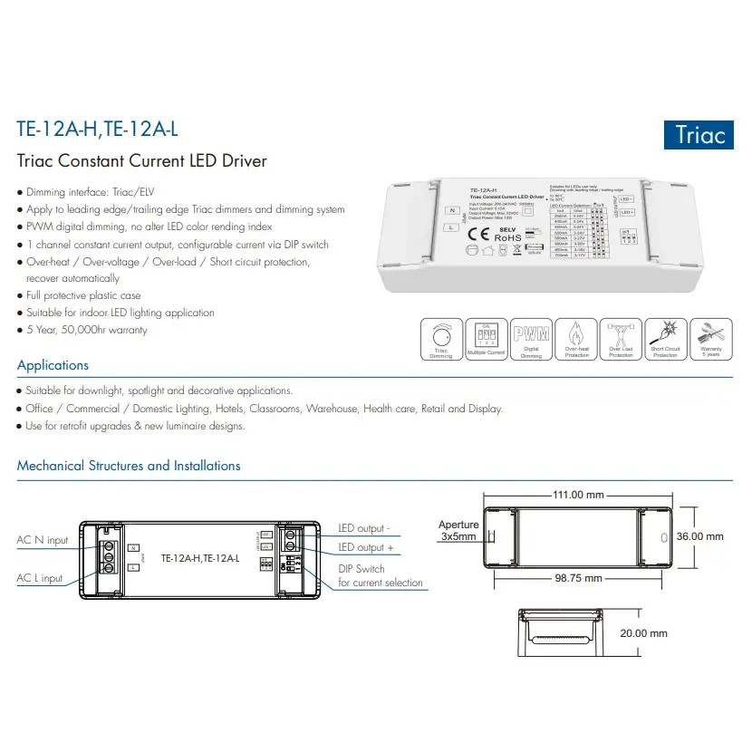 Aukštos kokybės „Starwell“ 12 W nuolatinės srovės triacinio pritemdymo LED tvarkyklė integruoja apsaugos nuo viršįtampio, viršsrovių ir trumpojo jungimo funkcijas, pasižymi dideliu galios koeficientu ir mažu harmoniniu iškraipymu, atitinkančiu daugybę tarptautinių energijos vartojimo efektyvumo ir saugos standartų. Dėl kompaktiško dizaino jį lengva montuoti ir jis tinka įvairiems patalpų apšvietimo scenarijams, pvz., apatiniams, prožektoriams ir dekoratyviniams žibintams, todėl tai yra idealus vairuotojo sprendimas energiją taupantiems renovacijos darbams ir išmaniesiems apšvietimams. ProduktasSavybės: