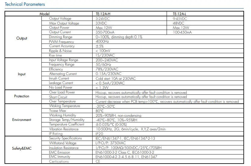 Įvesties įtampa: 200–240 VAC 50–60 Hz Įėjimo srovė: 0,15A Išėjimo galia: maks. 12 vatų Išėjimo įtampa: 9~42V Garantija: 2 metai Sertifikatas: CE/Rohs