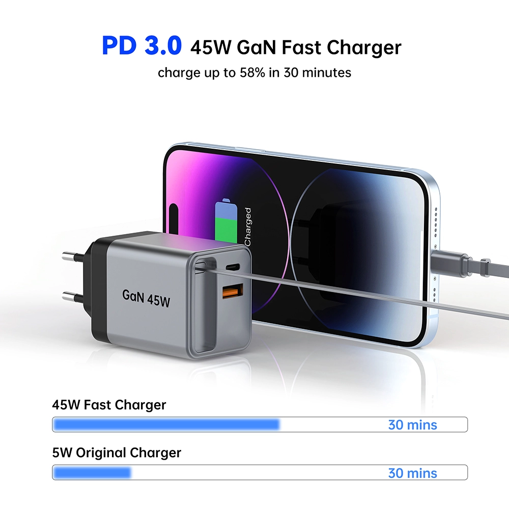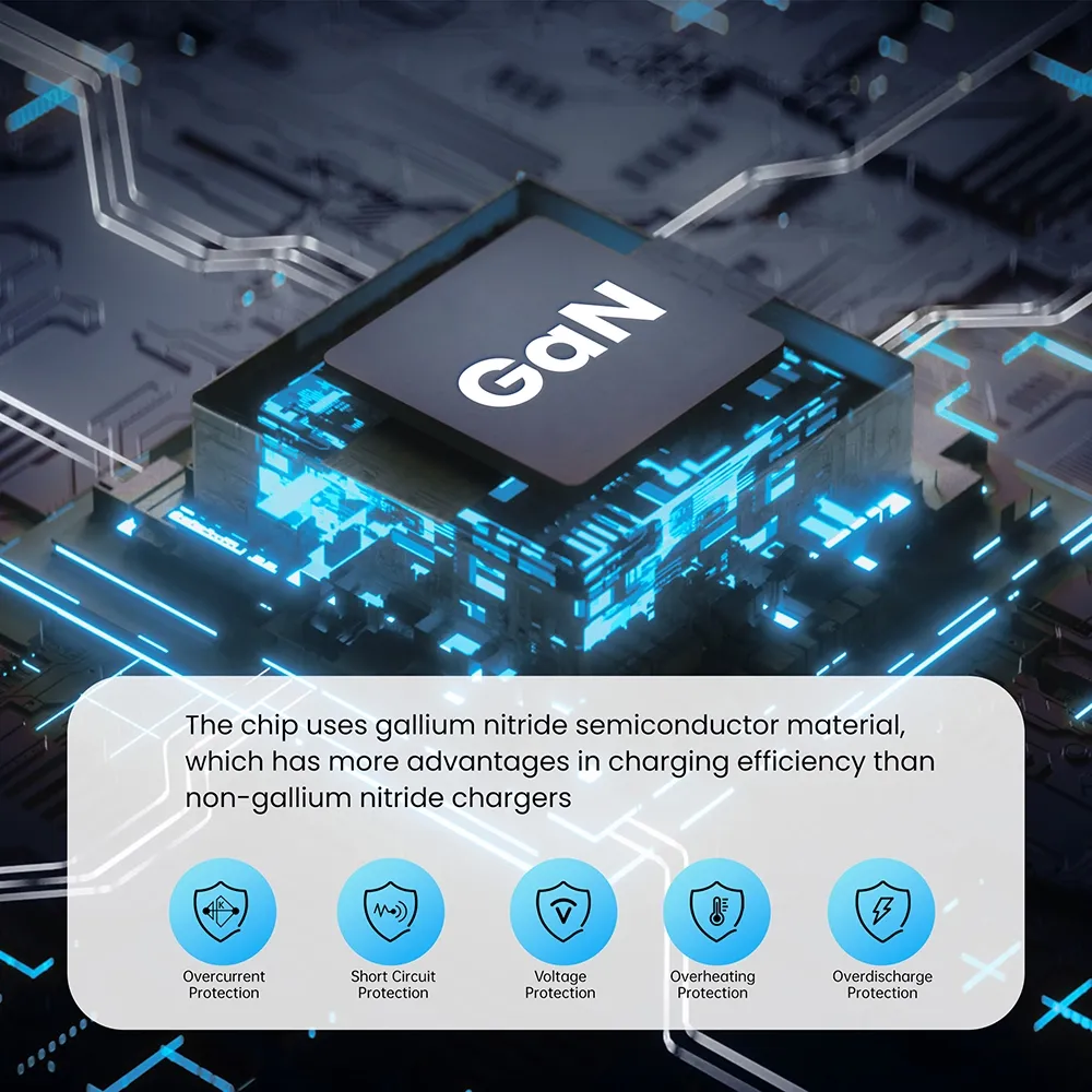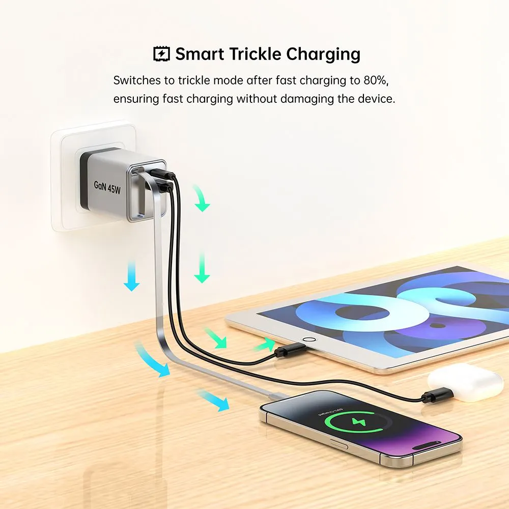 Greitas įkrovimas: GAN 45 W ištraukiamas greitas įkroviklis turi galingą 45 vatų išvestį, užtikrinantį greitą jūsų įrenginių įkrovimą.