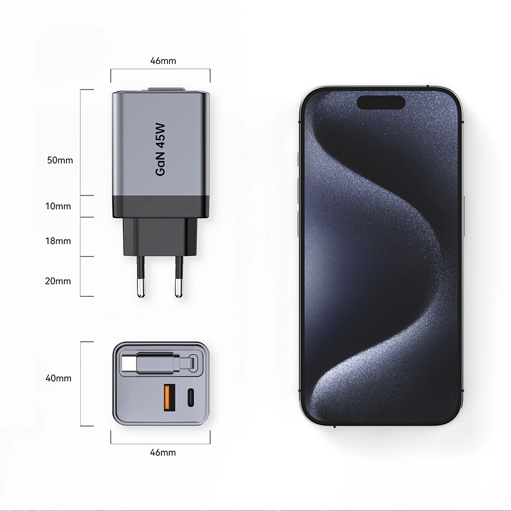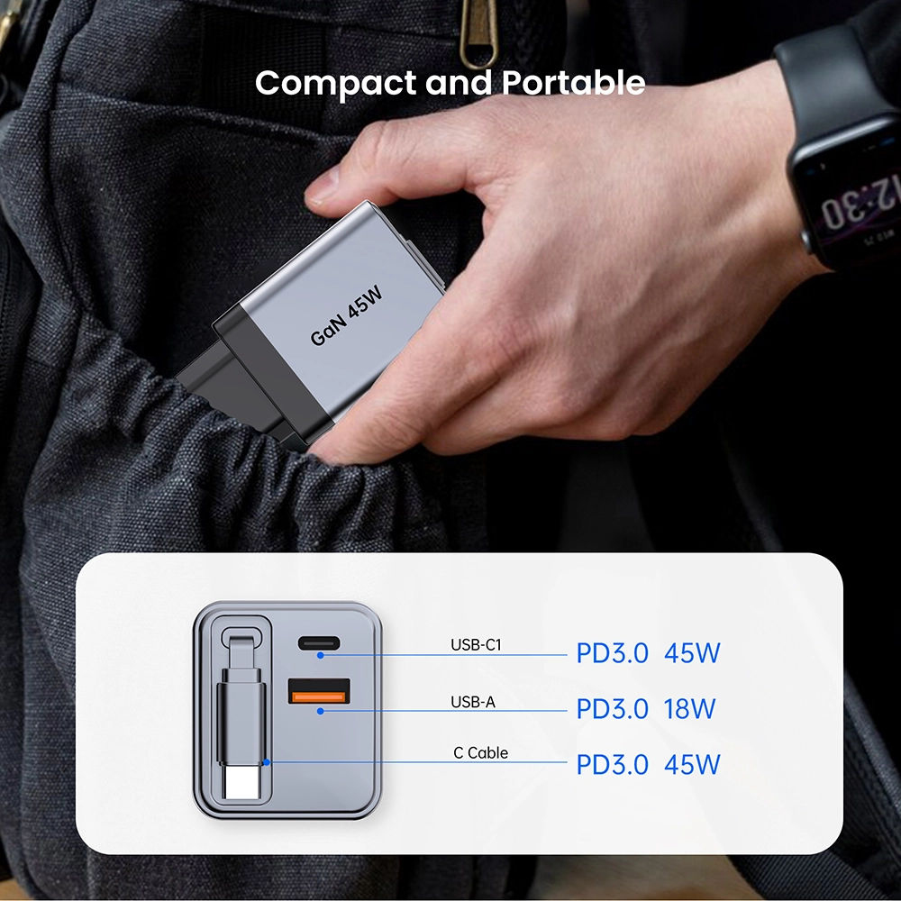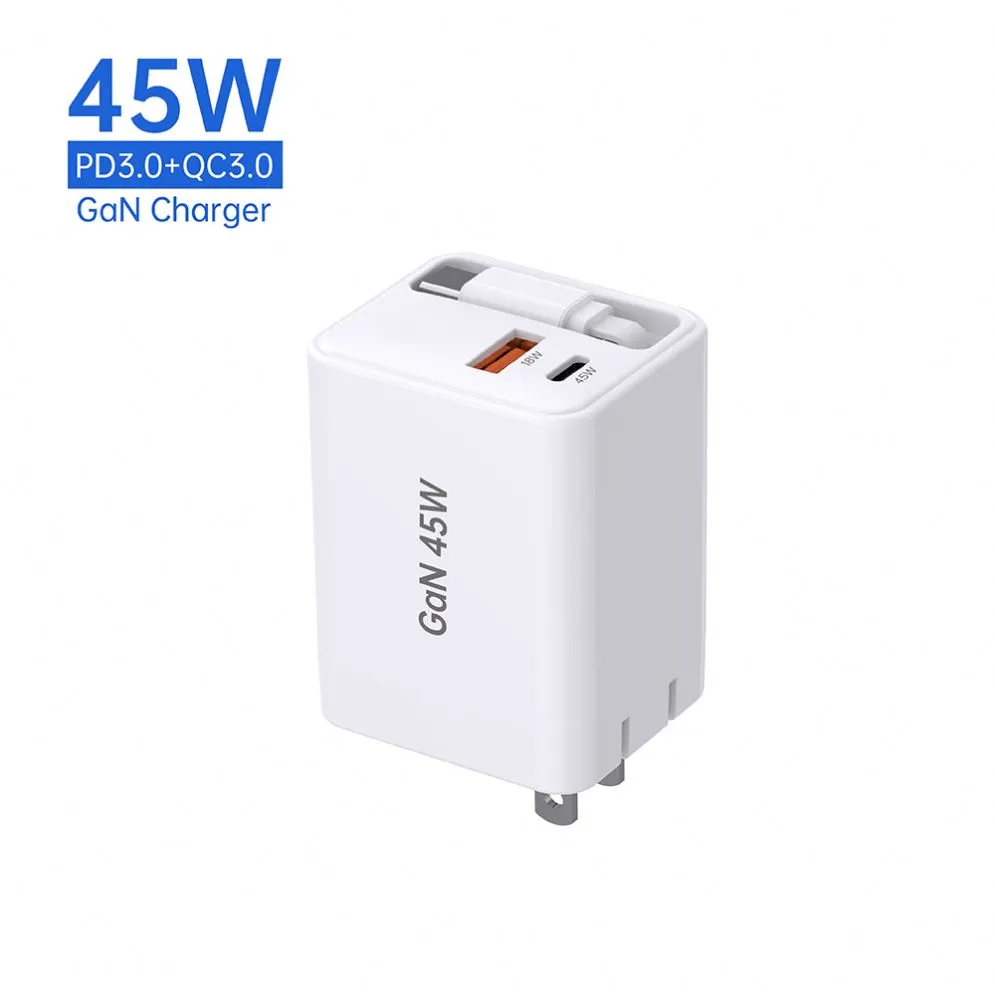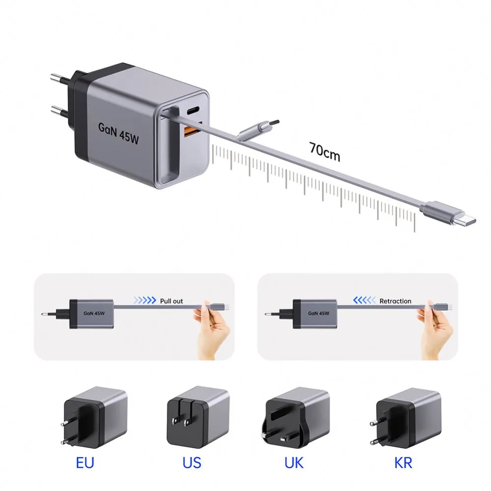 GAN 45 W ištraukiamas greitas įkroviklis USB-KABELIS+USB-A+USB-C 45W PD įkroviklis su laidu
