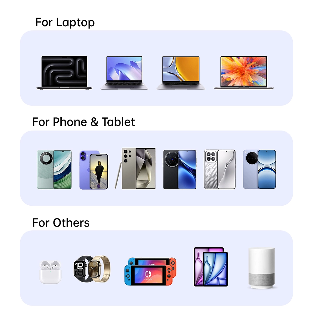 Universalus suderinamumas: mūsų pd įkroviklyje įdiegta Power Delivery (PD) technologija, todėl jis suderinamas su daugybe įrenginių, įskaitant išmaniuosius telefonus, planšetinius kompiuterius ir net tam tikrus nešiojamuosius kompiuterius. Tai geriausias visų jūsų prietaisų įkrovimo sprendimas.