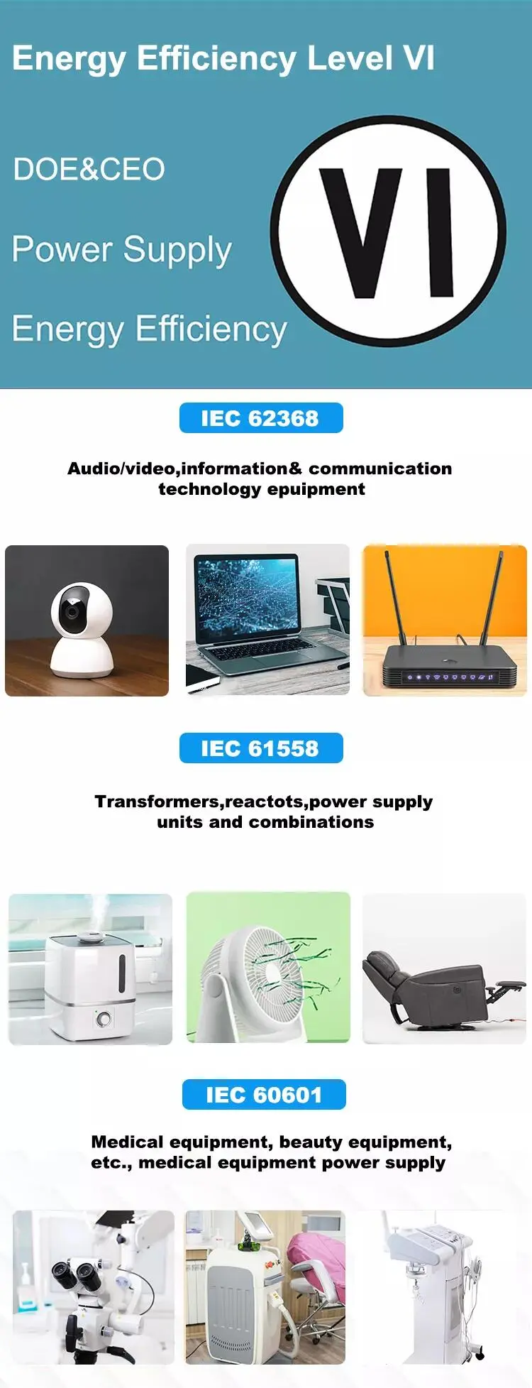 IEC62368 skirta buitinei elektronikai, IEC60335 skirta akumuliatoriaus įkrovikliui, IEC60601 skirta medicininei įrangai, IEC61558 skirta naudoti namuose, IEC61347 skirta LED apšvietimui. |