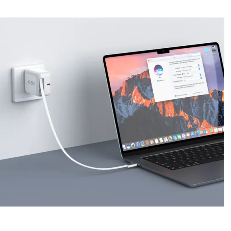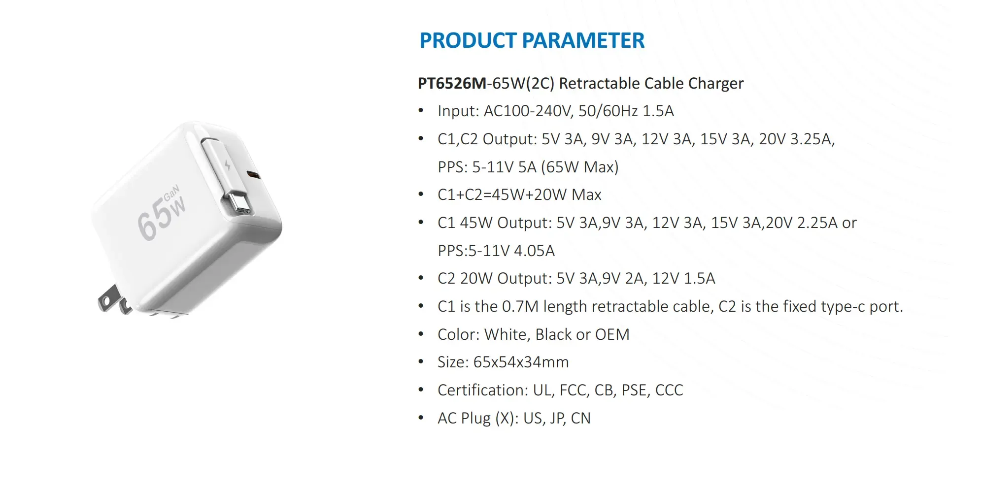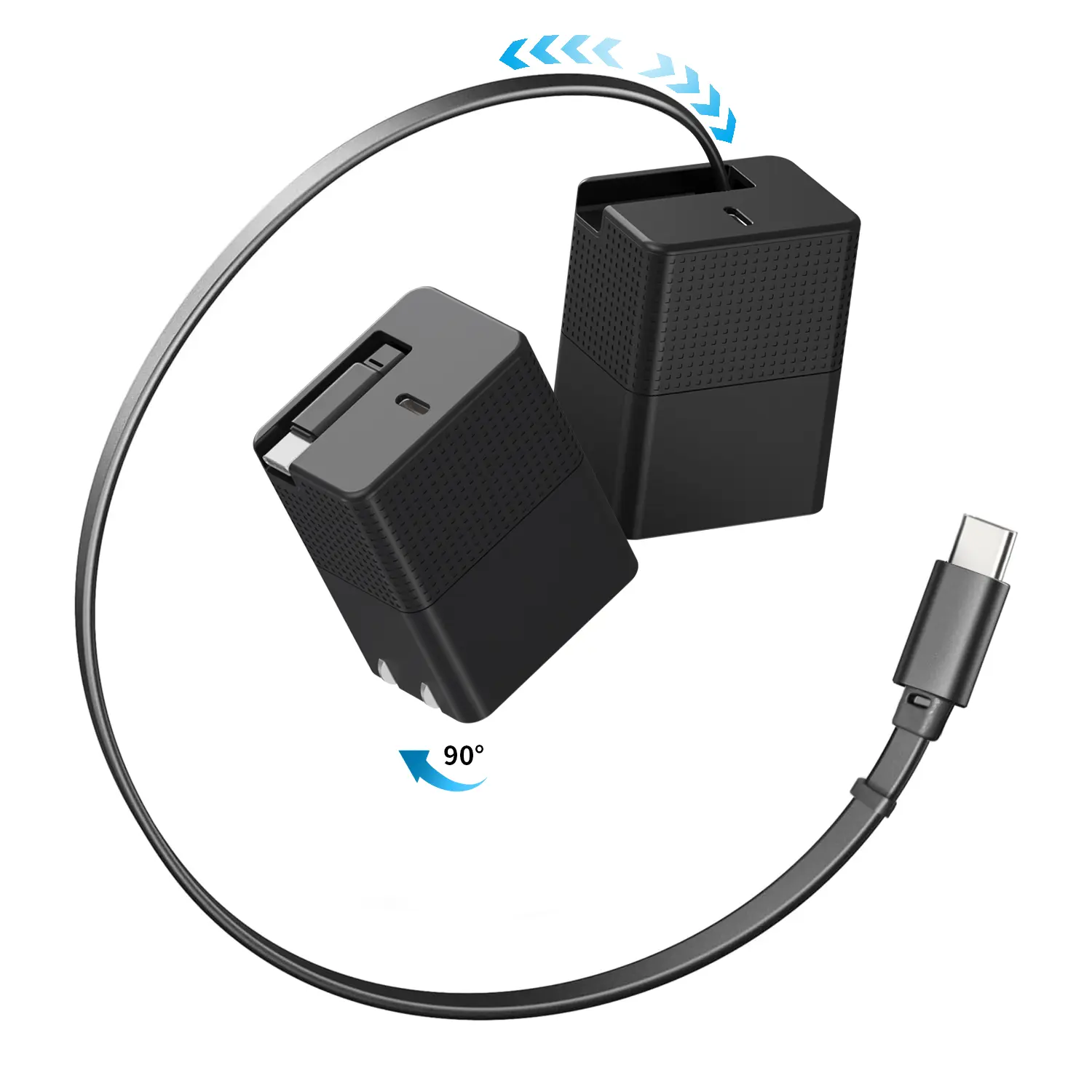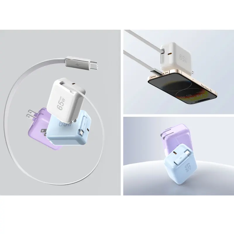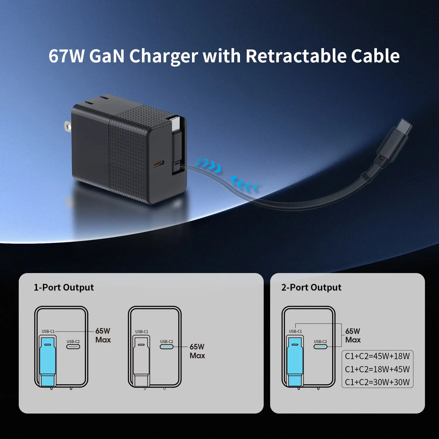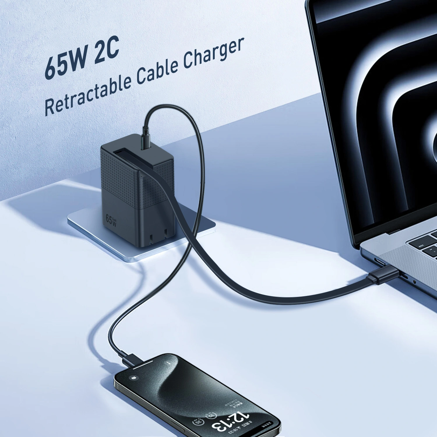 Įrengtas su ištraukiamais laidais: 65 W greitojo įkrovimo adapteryje yra patogus ir nesipainiojantis 2,3 pėdos (1 metro) ilgio USB-C duomenų kabelis. Šis laidas gali sklandžiai išsitiesti ir įsitraukti, taip išvengiant susipainiojusių laidų netvarkos ir užtikrinant, kad galėsite bet kada įkrauti.