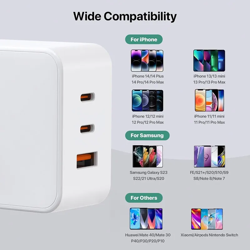Šis įkroviklis tiekia iki 65 W nuolatinės galios ir efektyviai įkrauna nešiojamuosius kompiuterius (pvz., MacBook Air/Pro, Dell XPS), planšetinius kompiuterius, išmaniuosius telefonus (iPhone, Samsung Galaxy) ir kitus įrenginius, palaikančius PD protokolą. Dėl kompaktiškos ir lengvos konstrukcijos jis idealiai tinka kelionėms, o įmontuota apsauga nuo viršįtampio, viršsrovių ir trumpojo jungimo užtikrina saugų įkroviklio ir prijungtų įrenginių įkrovimą. Paprastai jame yra 1-2 USB-C sąsajos, kurios palaiko kelių mažų įrenginių įkrovimą vienu metu, subalansuojant galią ir patogumą.