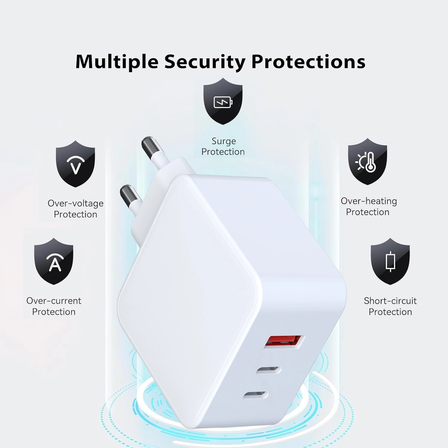 Kelių prievadų išmanusis įkrovimas – su dviem USB-C ir USB-A prievadais leidžia vienu metu įkrauti kelis įrenginius, nedarant įtakos greičiui.