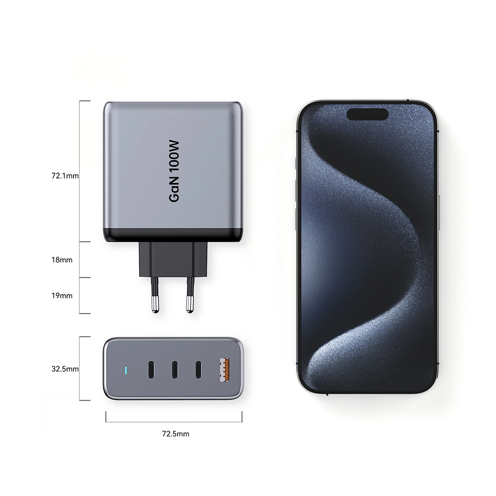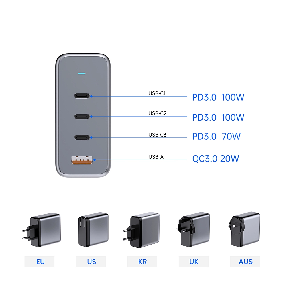 C1/C2 išėjimas: 5V3A, 9V3A, 12V3A, 15V3A, 20V5A, PPS: 3.3–20V5A (maks. 100 W) C3 išvestis: 5V3A, 9V3A, 12V3A, 15V3A, 20V3.5A, (maksimalus 70 W) PPS: 3.3-11V5A USB-A išvestis: 5V3A, 9V2A, 12V1.67A, SCP: 3.3-11V2A (maks. 22 W) C1+C2/C1+C3 Išėjimas: 70W+30W C1+C2+(C3+USB-A) Išėjimas: 40W+40W+15W Iš viso: 100W |