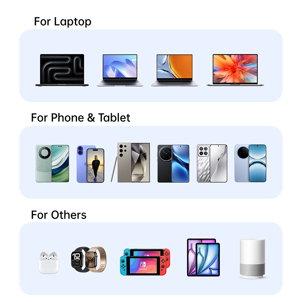 Greitai įkraukite kelis įrenginius vienu metu, kad darbo vieta būtų tvarkinga ir tvarkinga. „Starwell“ patvarus GaN 100 W greitasis įkroviklis turi tris USB-C prievadus ir vieną USB-A prievadą, leidžiantį vienu metu maitinti iki keturių įrenginių. Nesvarbu, ar jis naudojamas versle, ar namuose, jis gali lengvai atlikti užduotis. Nuo nešiojamojo kompiuterio, mobiliojo telefono, planšetinio kompiuterio iki išmaniojo laikrodžio – viskas gali būti visiškai įkrauta kartu ir galiausiai baigsis lizdų užėmimo era. Tai suteikia jūsų stalo paprastumo ir didelio efektyvumo.