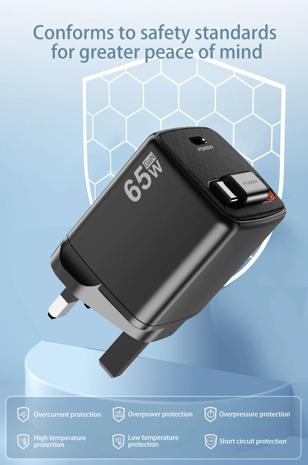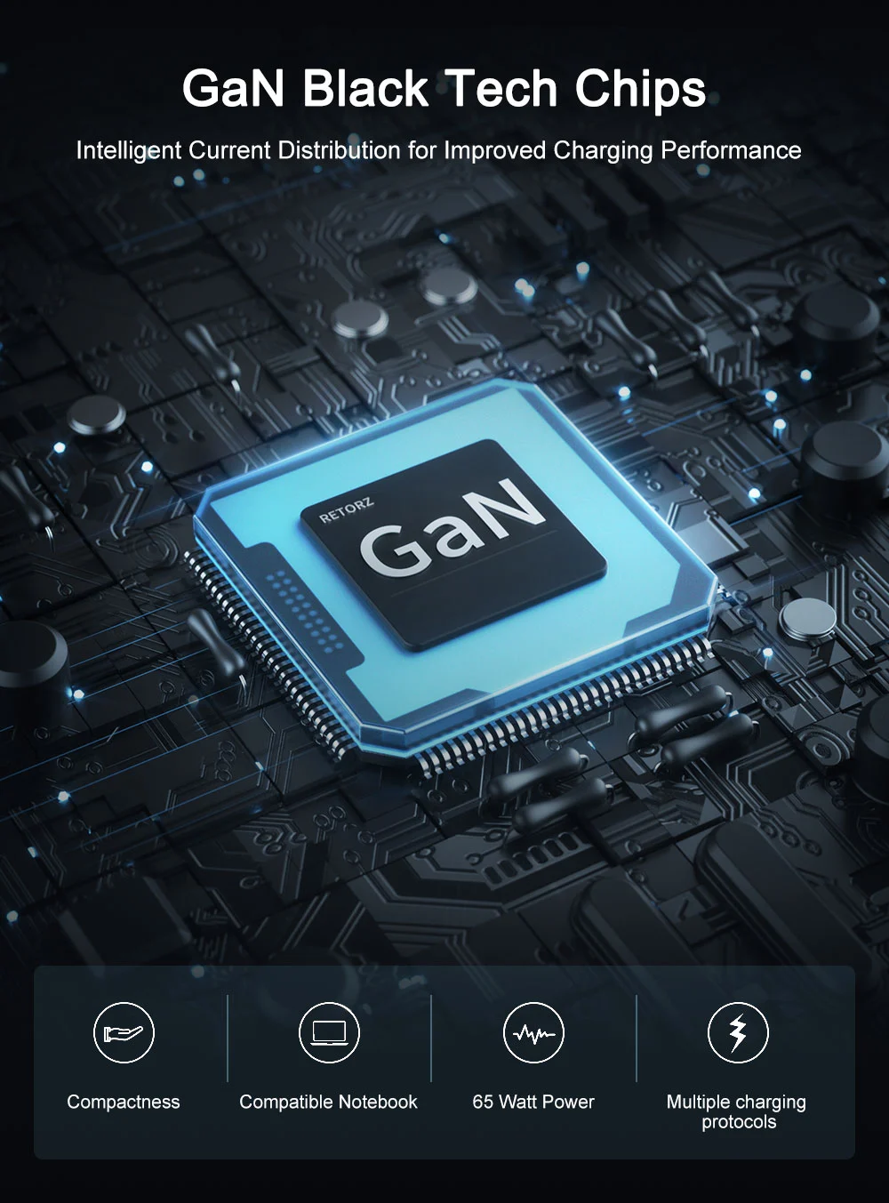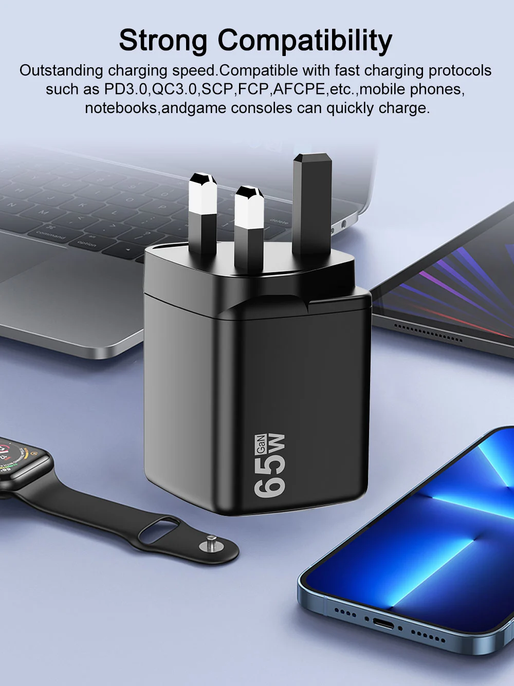 - Greitas įkrovimas: 65 W išvestis sumažina įkrovimo laiką, todėl jūsų įrenginiai greitai įsijungia.